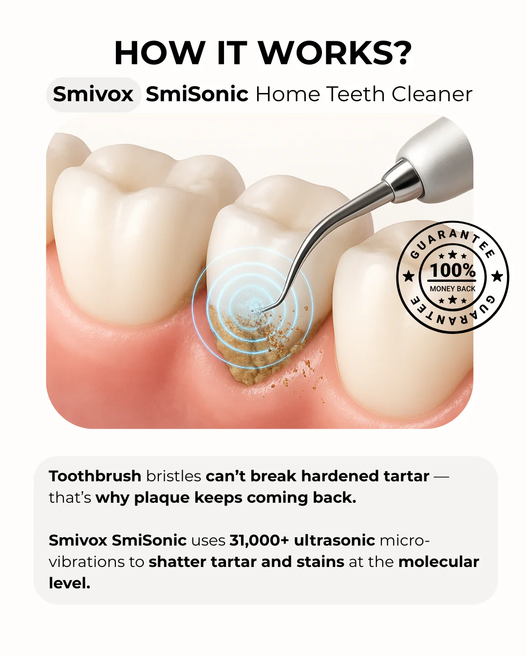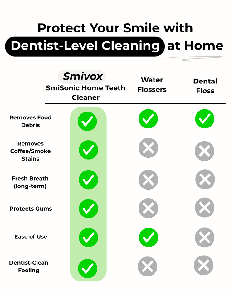 SmiVox combines all the benefits in one device, giving you dentist-level cleaning in just minutes, right from home.