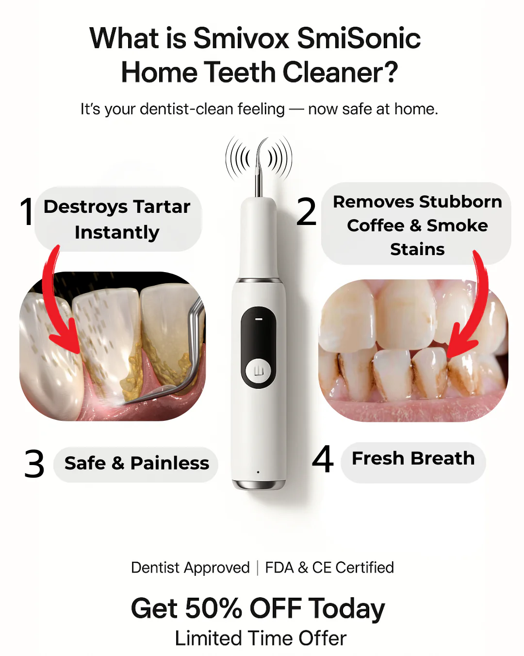 Yes, the device is dentist-approved and clinically safe for home use. Its safe metal tip is designed to protect your gums and enamel.